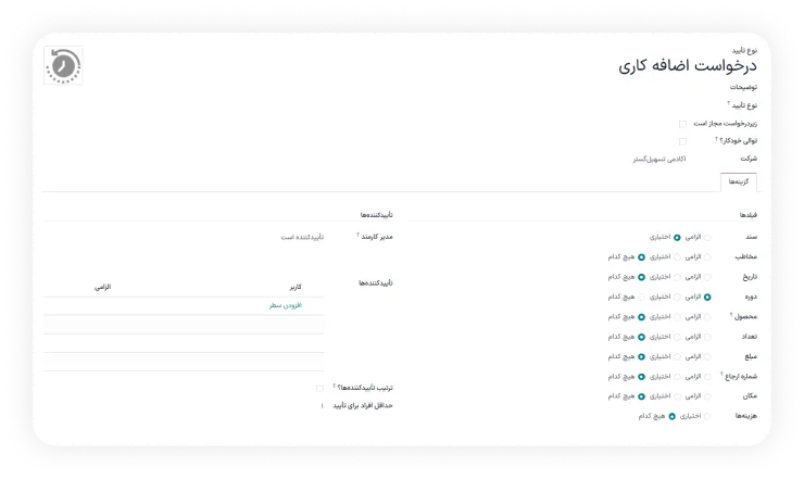 میتوانید فرد یا افرادی را مشخص کنید که باید هر درخواست را تأیید کنند، حتی اگر مدیر نباشند. برای برخی درخواستها نیاز به تأیید مدیر و حسابدار دارید؟ سازمانیار به شما امکان میدهد تصمیم بگیرید که کدام ترکیب تأییدکنندگان برای هر نوع درخواست الزامی است.
