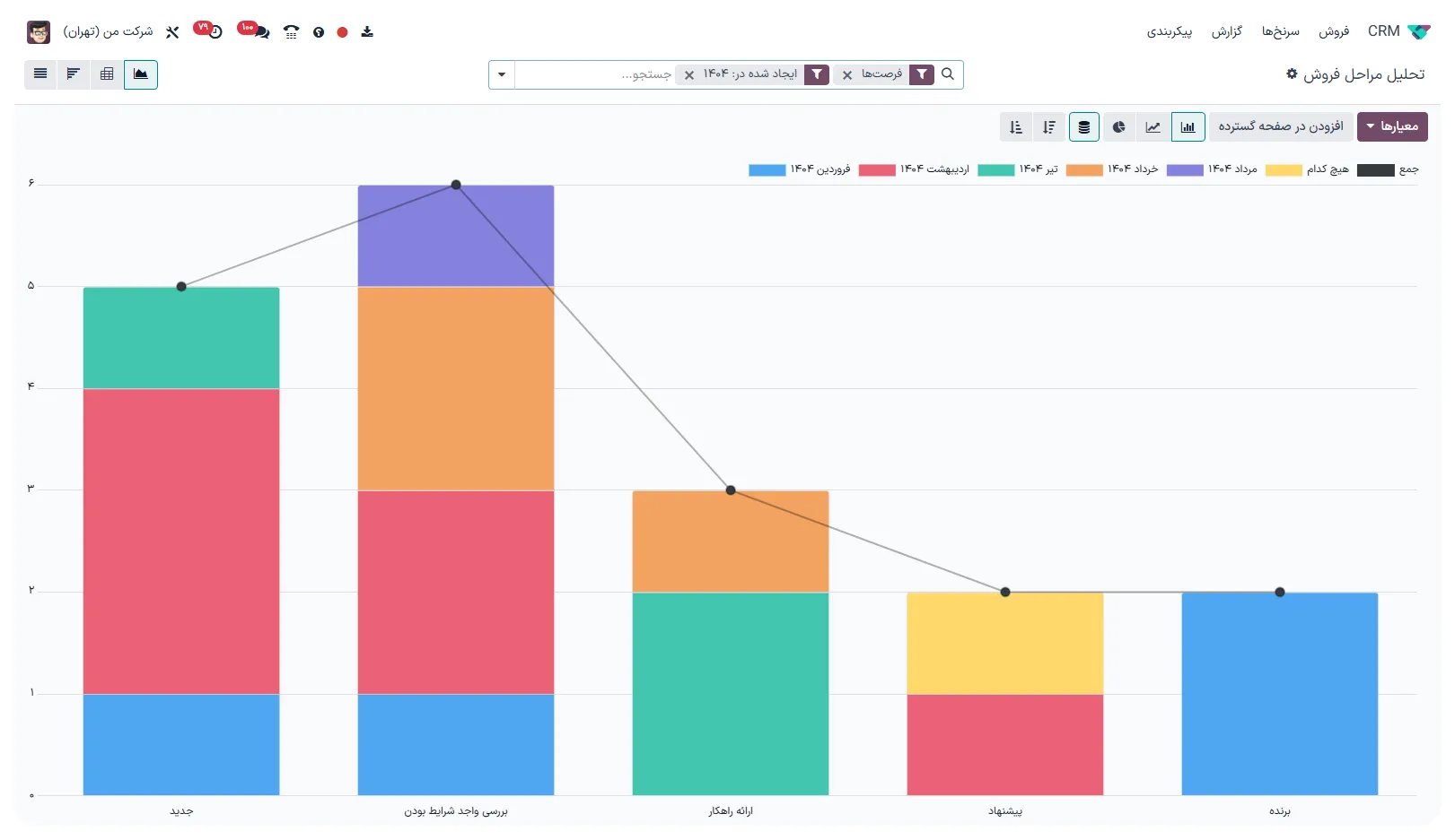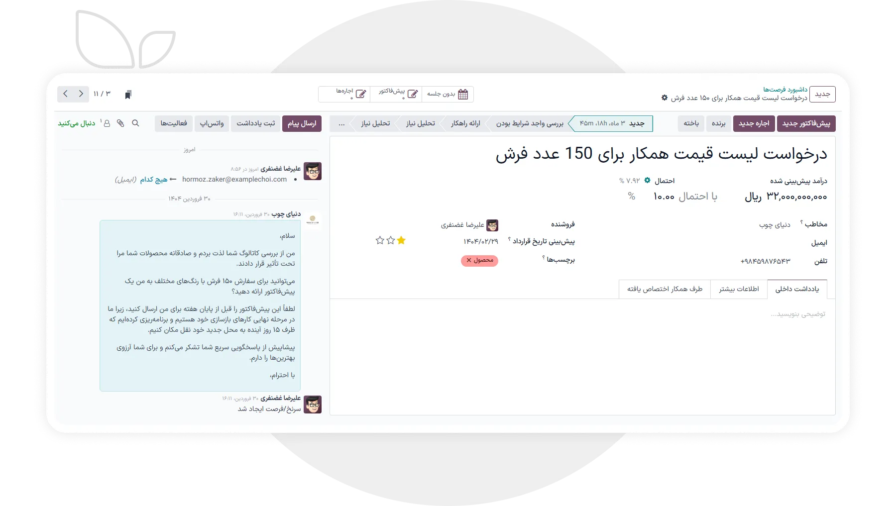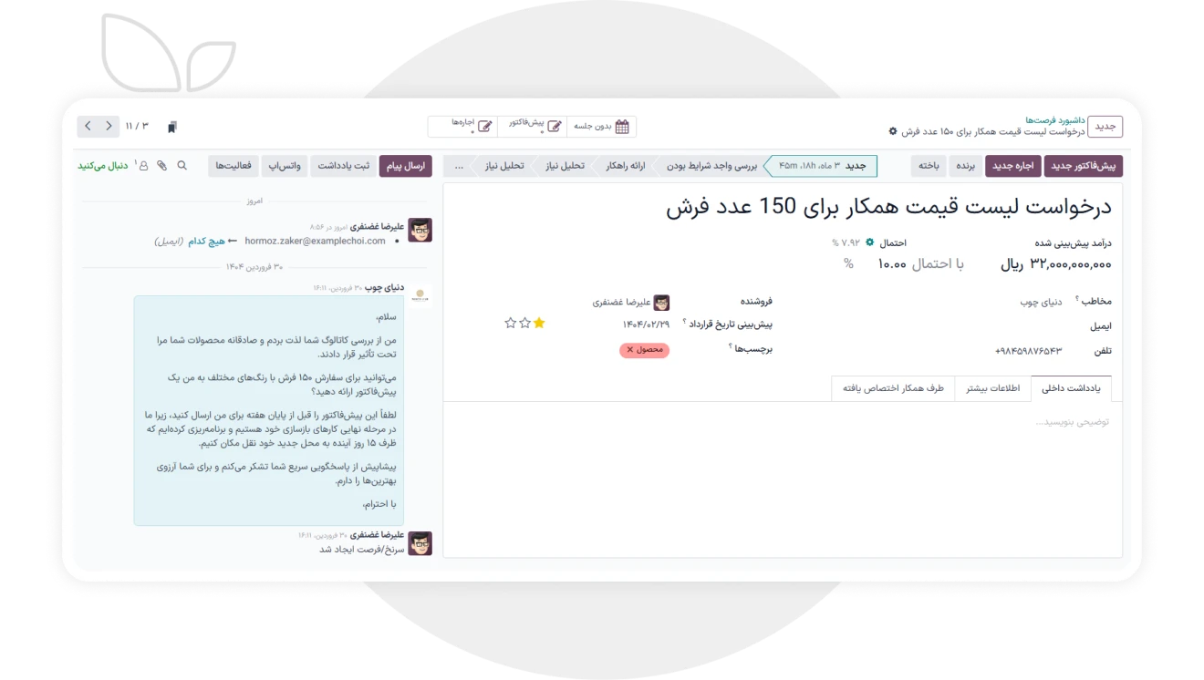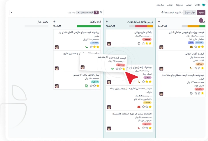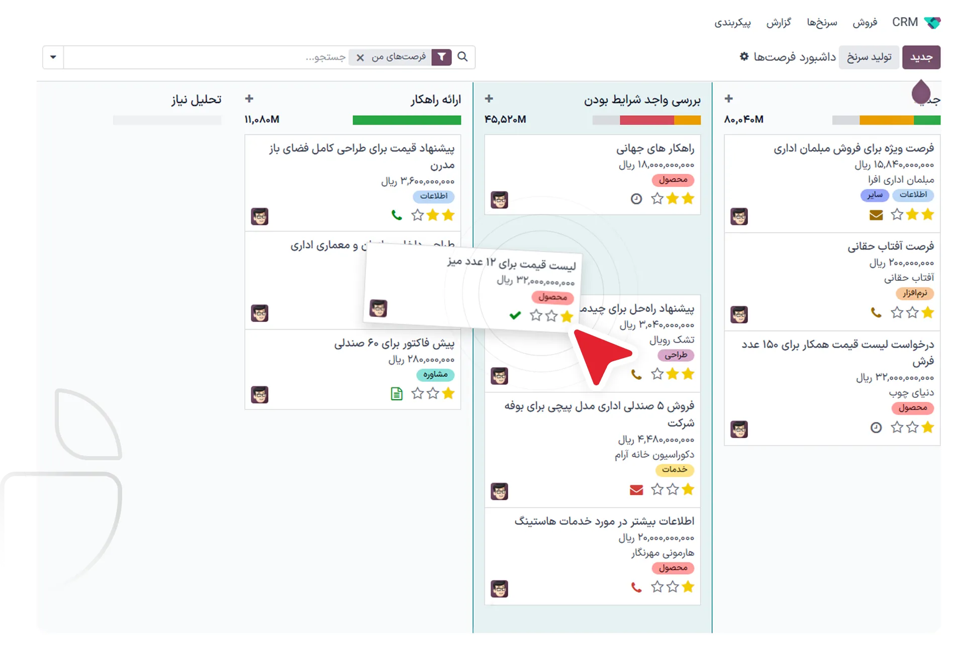 در نرمافزار CRM سازمانیار، هر فرصت بهصورت یک کارت نمایش داده میشود و شامل اطلاعات کلیدی از جمله ارزش پیشبینیشده، وضعیت فعلی، مشتری مرتبط و مسئول فروش است.