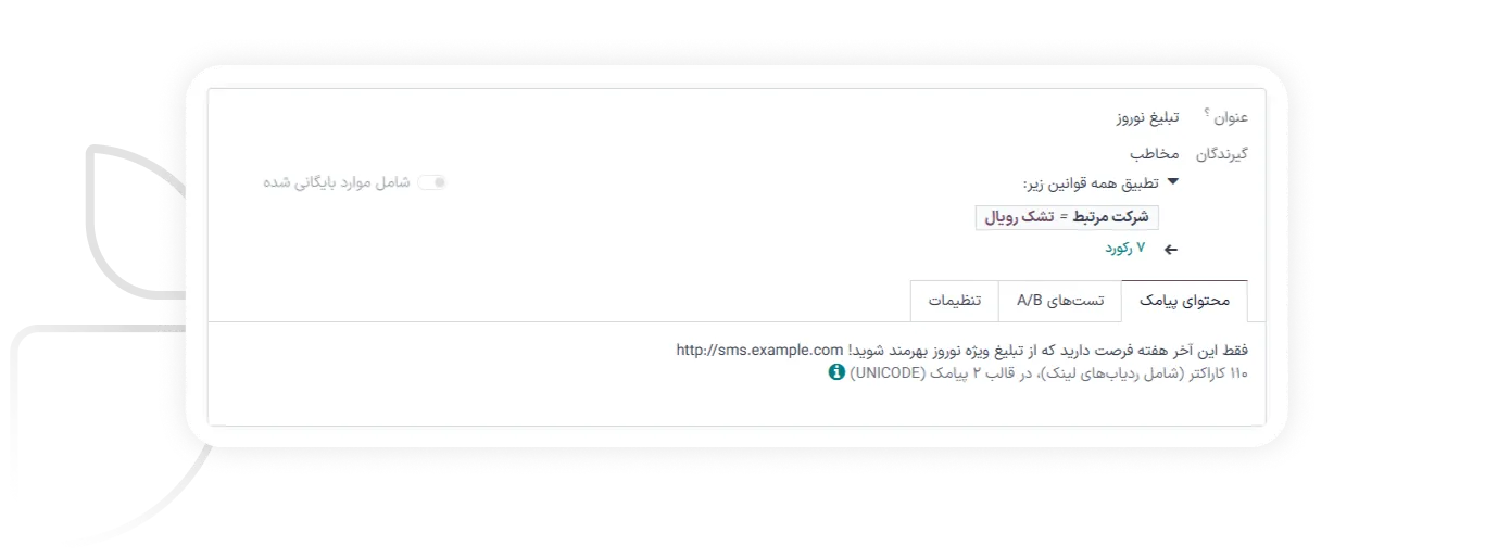 یکی از مزیتهای بزرگ بازاریابی پیامکی در سازمانیار، امکان تقسیمبندی دقیق مخاطبان است. پیام خود را بر اساس سفارشهای گذشته، سبدهای خرید رهاشده، اشتراک در خبرنامه، حضور در رویدادها، یا حتی انتخاب دستی مخاطبان، به گروههای هدف مشخص ارسال کنید.