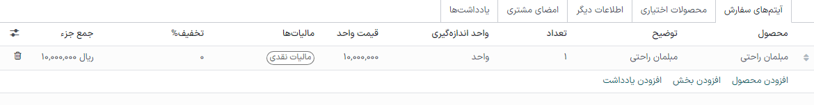در تب تنظیمات پیشرفته یکی از گزینههای مشمولیت مالیاتی`را انتخاب کنید. برای اینکه سررسید مالیات به هنگام دریافت وجه فاکتور باشد :guilabel:`بر اساس پرداخت را انتخاب نمایید. با انتخاب این گزینه همچنین میتوانید حساب انتقالی مبنای نقدی را برای ثبت مبلغ مالیات تا زمان مغایرتگیریِ فاکتور اصلی تعیین کنید.
