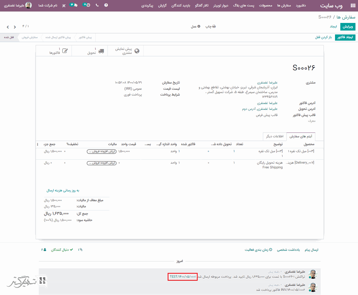 برای بررسی وضعیت پرداخت، به ماژول وب سایت> سفارش ها> سفارش ها بروید. سپس، به سادگی بر روی سفارشی که می خواهید بررسی کنید، کلیک نمایید. پس از ورود به صفحه سفارش فروش، متوجه خواهید شد که پرداخت با یادداشت خودکار در کادر پیامک تأیید شده است.