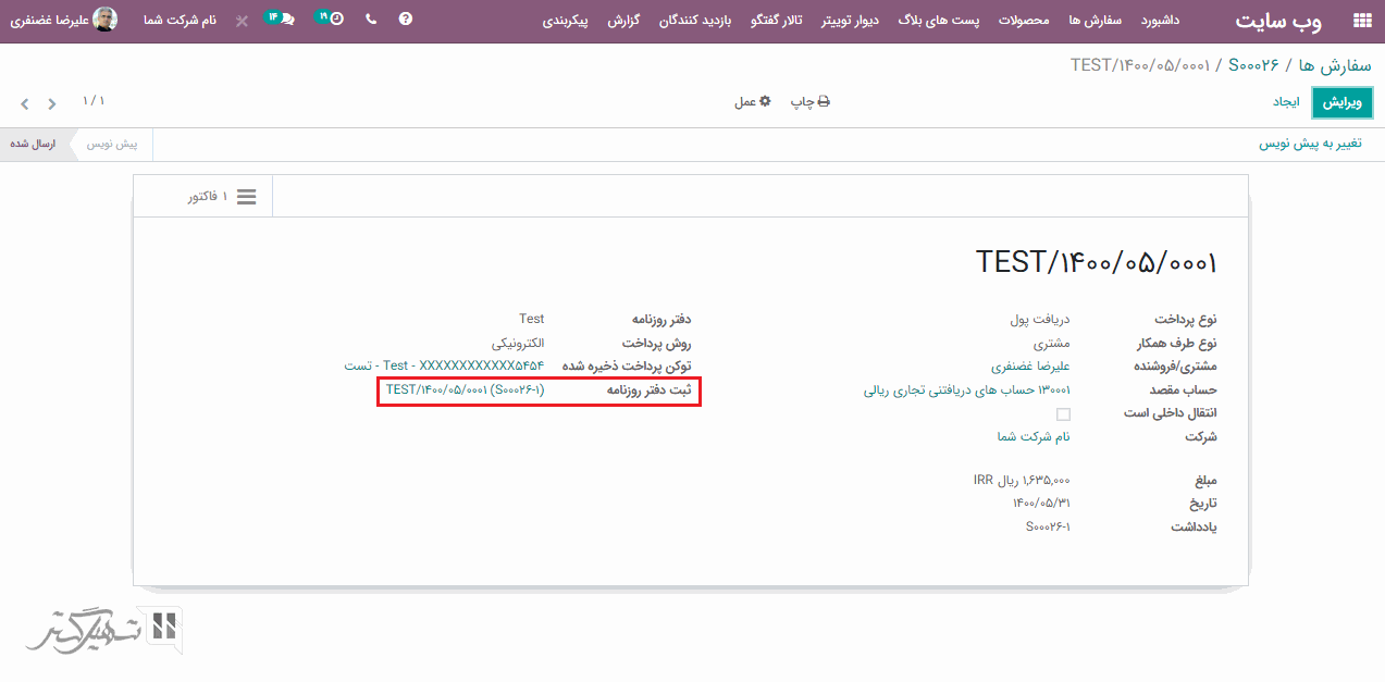 اگر کاربر تصمیم به ایجاد یک فاکتور داشته باشد، پرداخت مستقیماً با هم تطبیق داده می شود. این یادداشت در کادر پیام شامل یک لینک به داده های پرداخت است که اگر آن را باز کنید، جزئیات مختلف در مورد تراکنش به همراه لینک به داده های دفتر روزنامه مربوطه را مشاهده خواهید کرد: