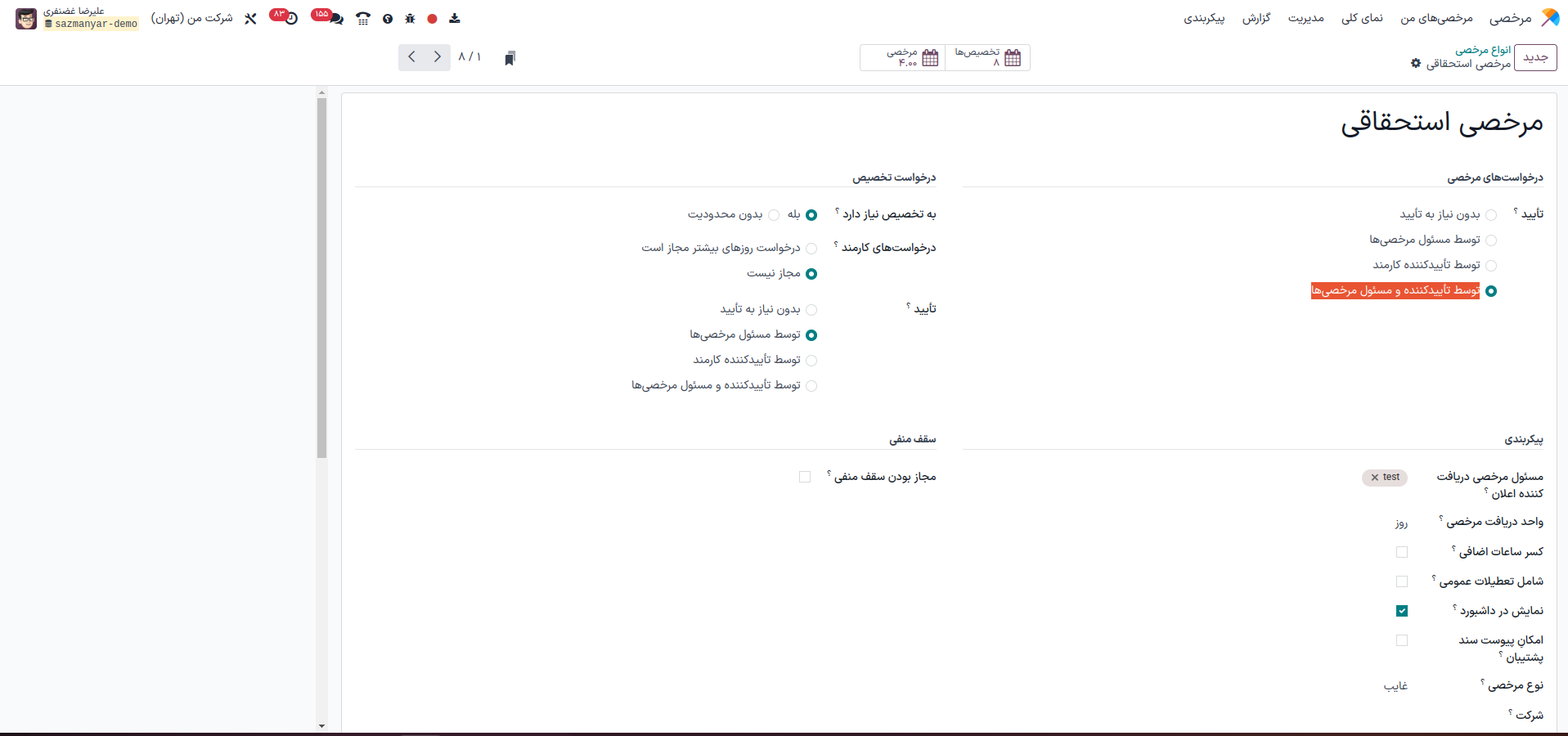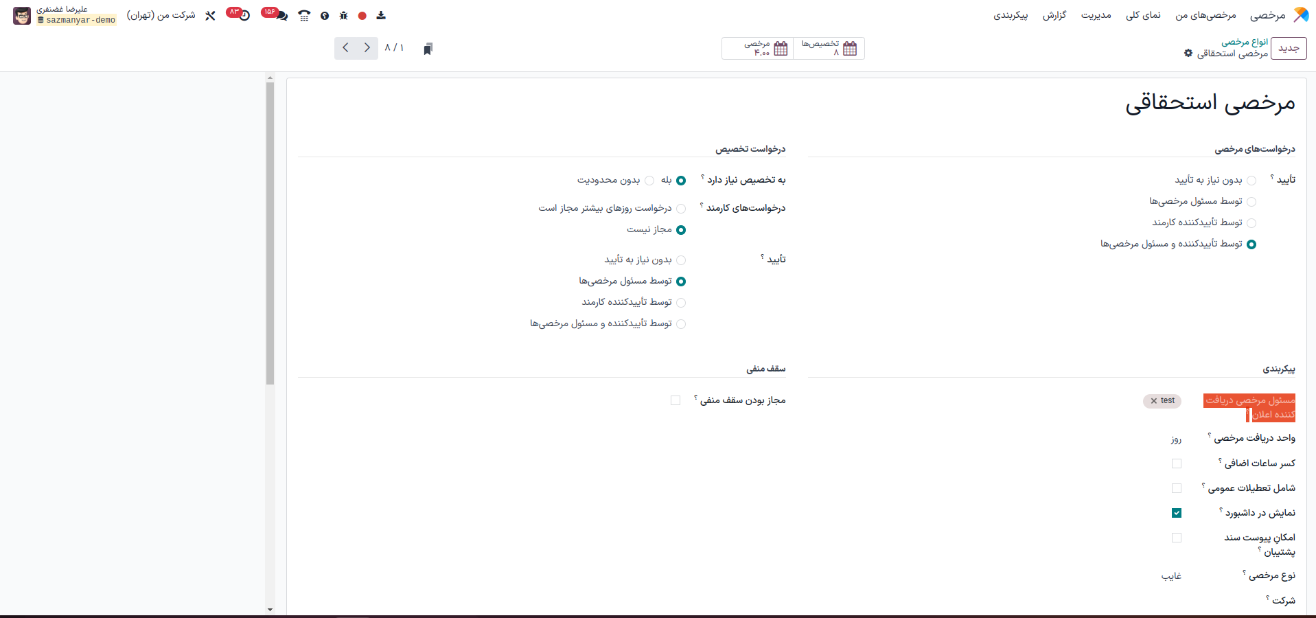 در صورتی که تمایل دارید تأیید مرحله دوم توسط فرد خاصی انجام شود، میتوانید در فرم نوع مرخصی، فیلد