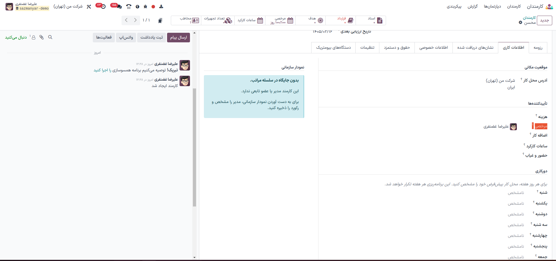 پس از ثبت درخواست مرخصی توسط کارمند، ابتدا اعلان (نوتیفیکیشن) برای مدیر مستقیم کارمند (که در فرم کارمند در بخش اطلاعات کاری کارمند -> بخش تایید کنندهها -> در فیلد مرخصی تعریف شده است) ارسال میشود.