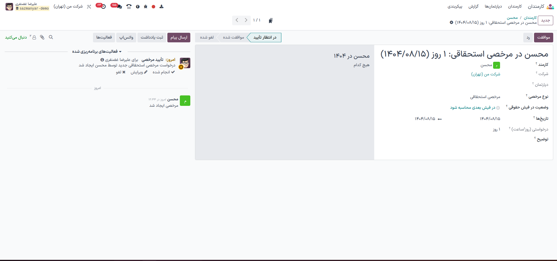 مدیر میتواند پس از بررسی، درخواست را تأیید یا رد کند. با تأیید مدیر، وضعیت درخواست از حالت «در انتظار تأیید» به حالت «تأیید اولیه» تغییر میکند.