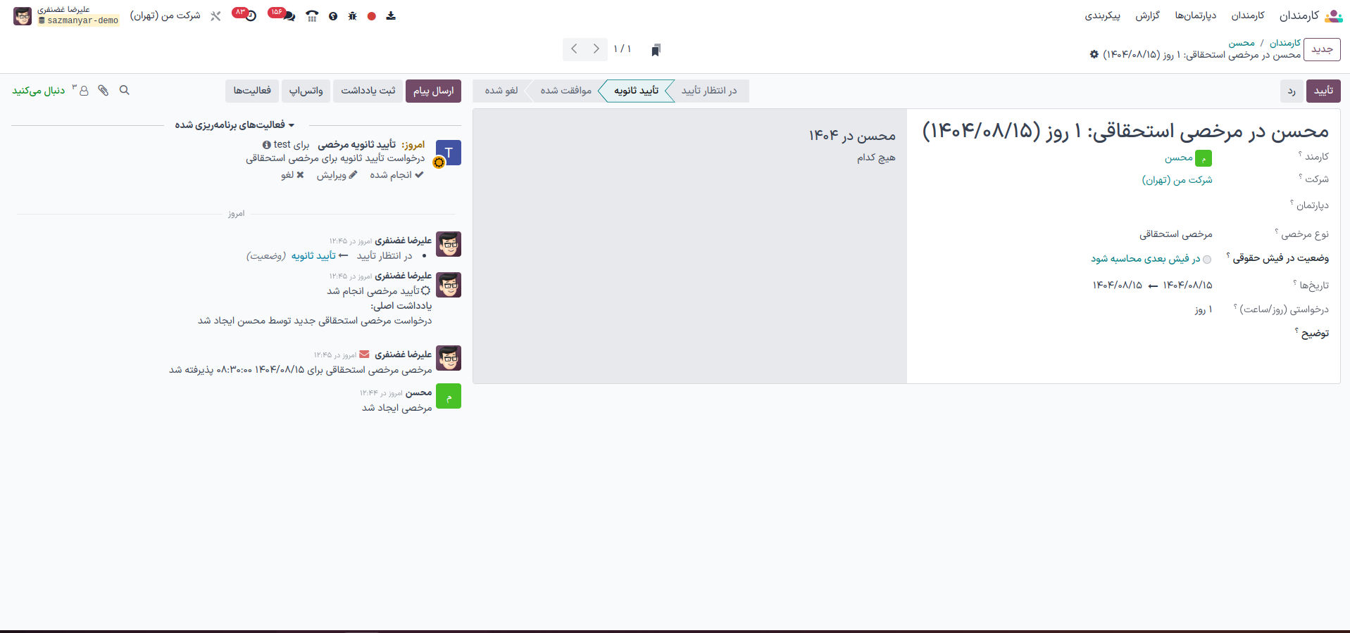 در اودوو، در صورتی که نوع مرخصی (در بخش پیکربندی > انواع مرخصی) به حالت تأیید دو مرحلهای تنظیم شده باشد، فرآیند تأیید مرخصی بهصورت زیر انجام میشود: