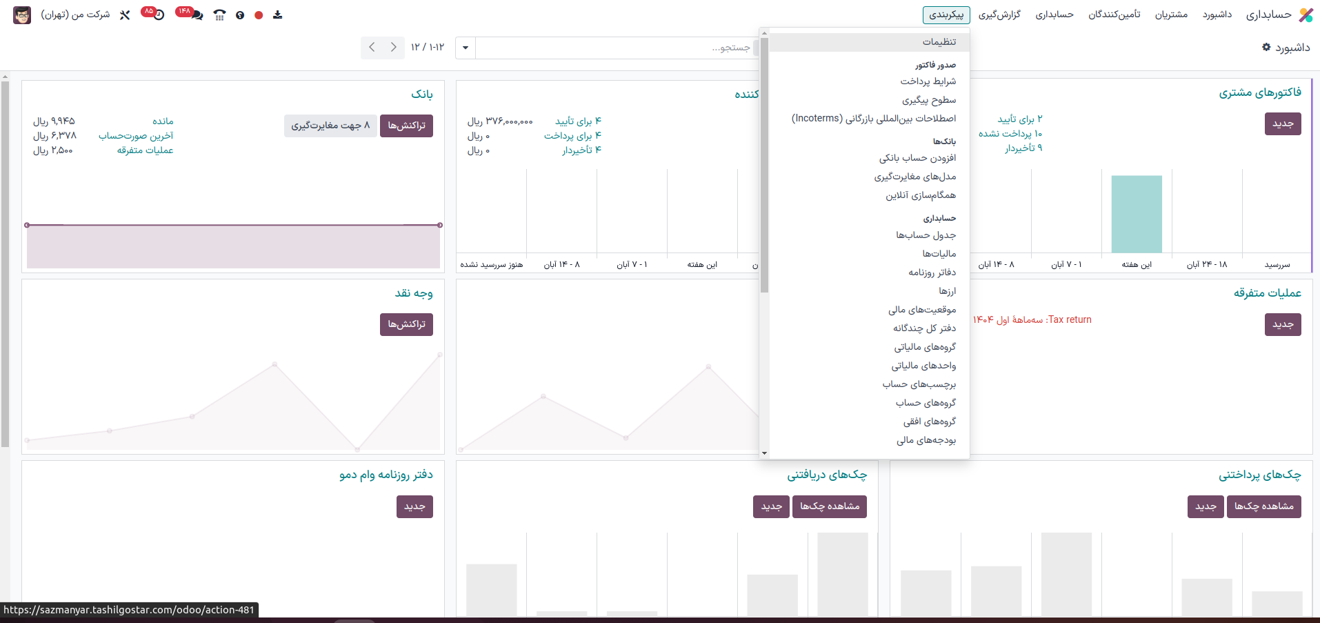 - در ماژول حسابداری از منوی پیکربندی وارد تنظیمات شوید.