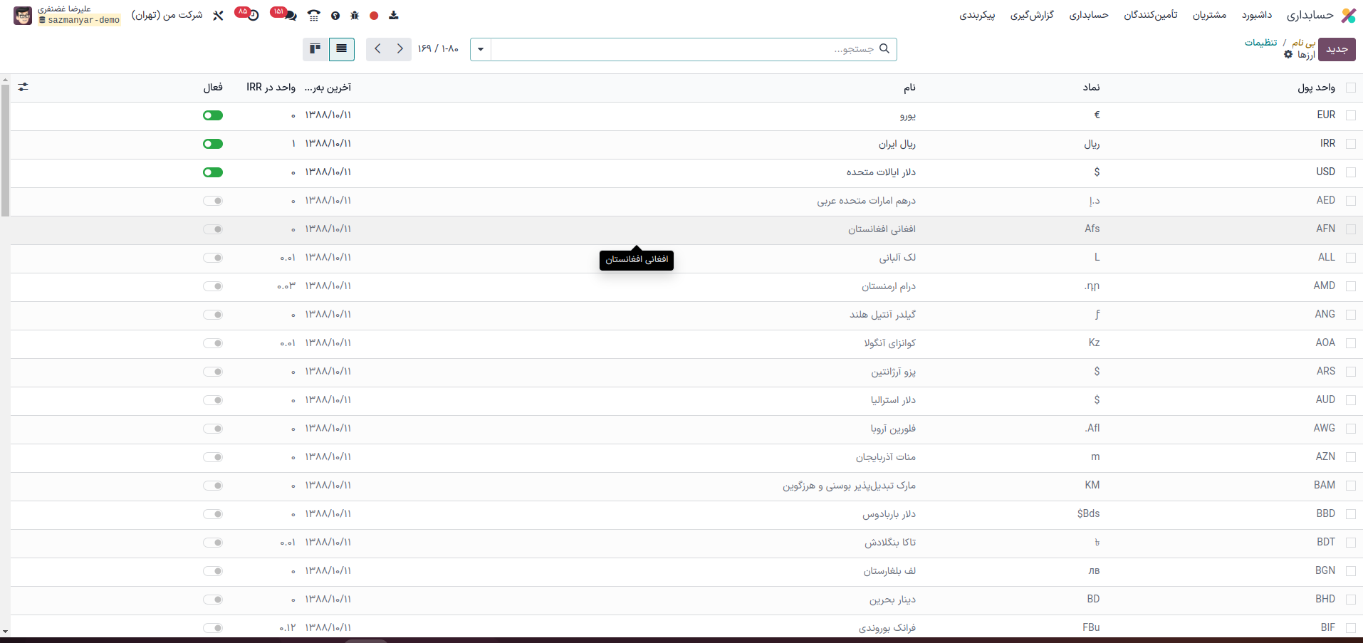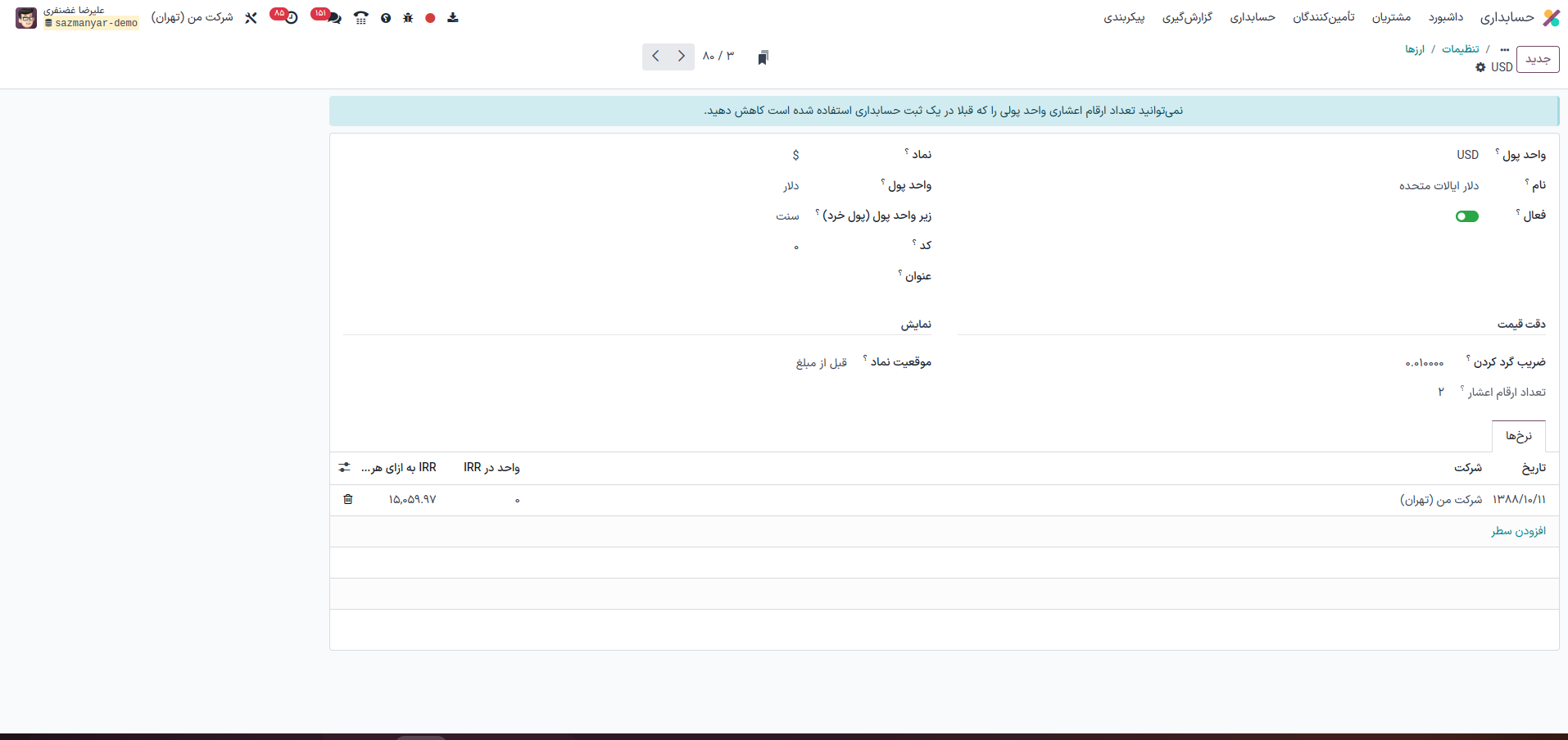 در این مثال، کاربران تصمیم گرفتند ریال ایران (IRR) را به عنوان ارز اصلی شرکت برای حسابداری انتخاب کنند.