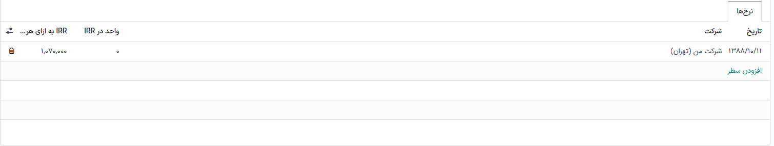 - واحد در IRR: نرخ ارز شرکت – نشان میدهد یک واحد ارز اصلی شرکت (IRR) برابر با چند واحد ارز انتخاب شده (USD) است
