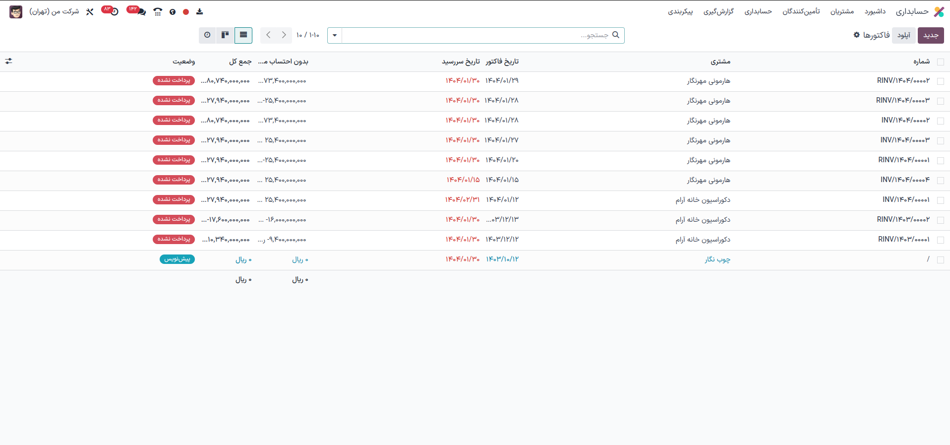 برای این منظور، به مسیر ماژول حسابداری -> مشتریان -> فاکتورها بروید تا یک فاکتور جدید ایجاد کرده و استفاده از چند ارز را بررسی کنید.