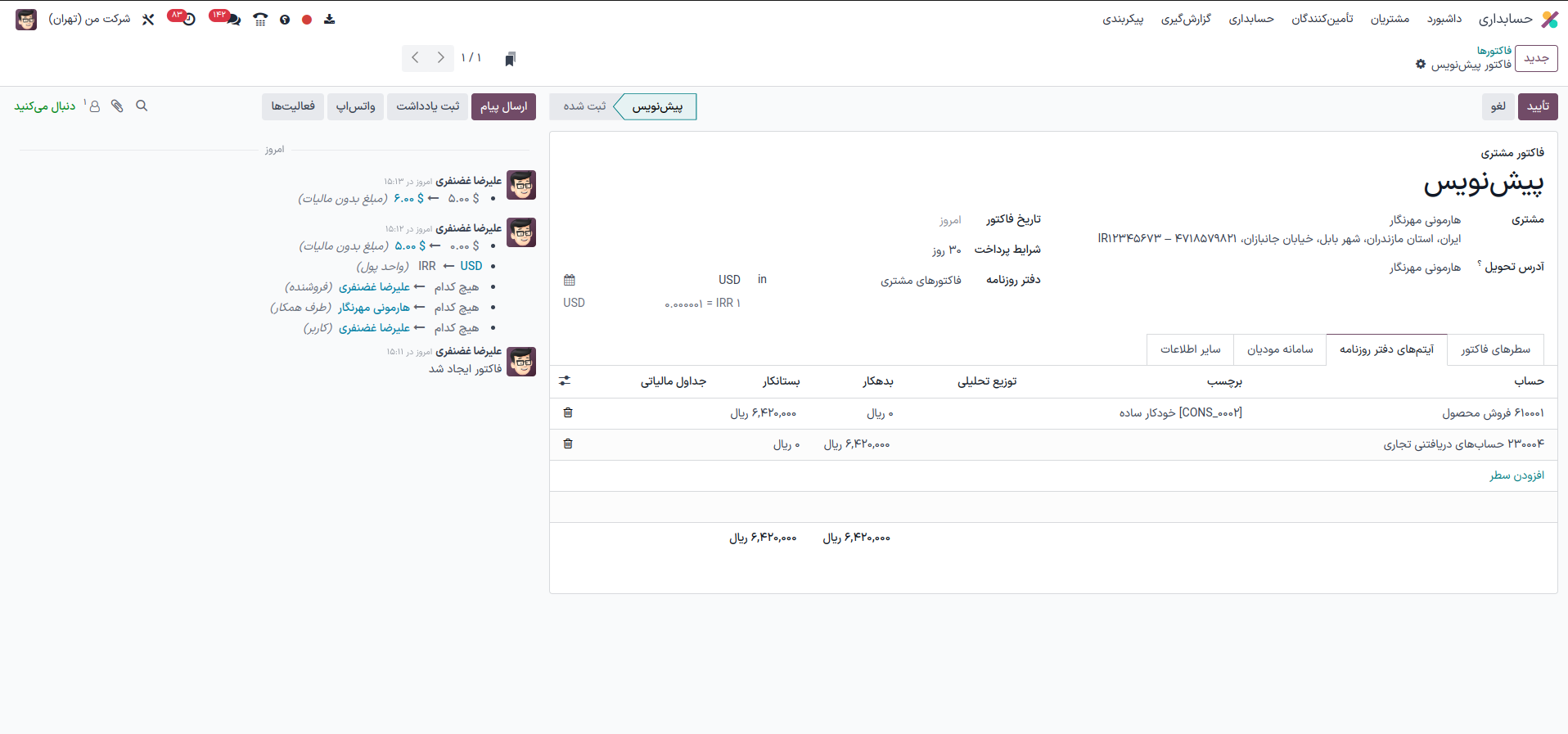 همانطور که مشاهده می کنید در بخش آیتمهای دفتر روزنامه حسابهای بدهکار و بستانکار مطابق ارز اصلی (ریال ایران) محاسبه شده، یعنی در آن واحد فاکتور ایجاد شده دلار آمریکا به ریال ایران تبدیل شد.