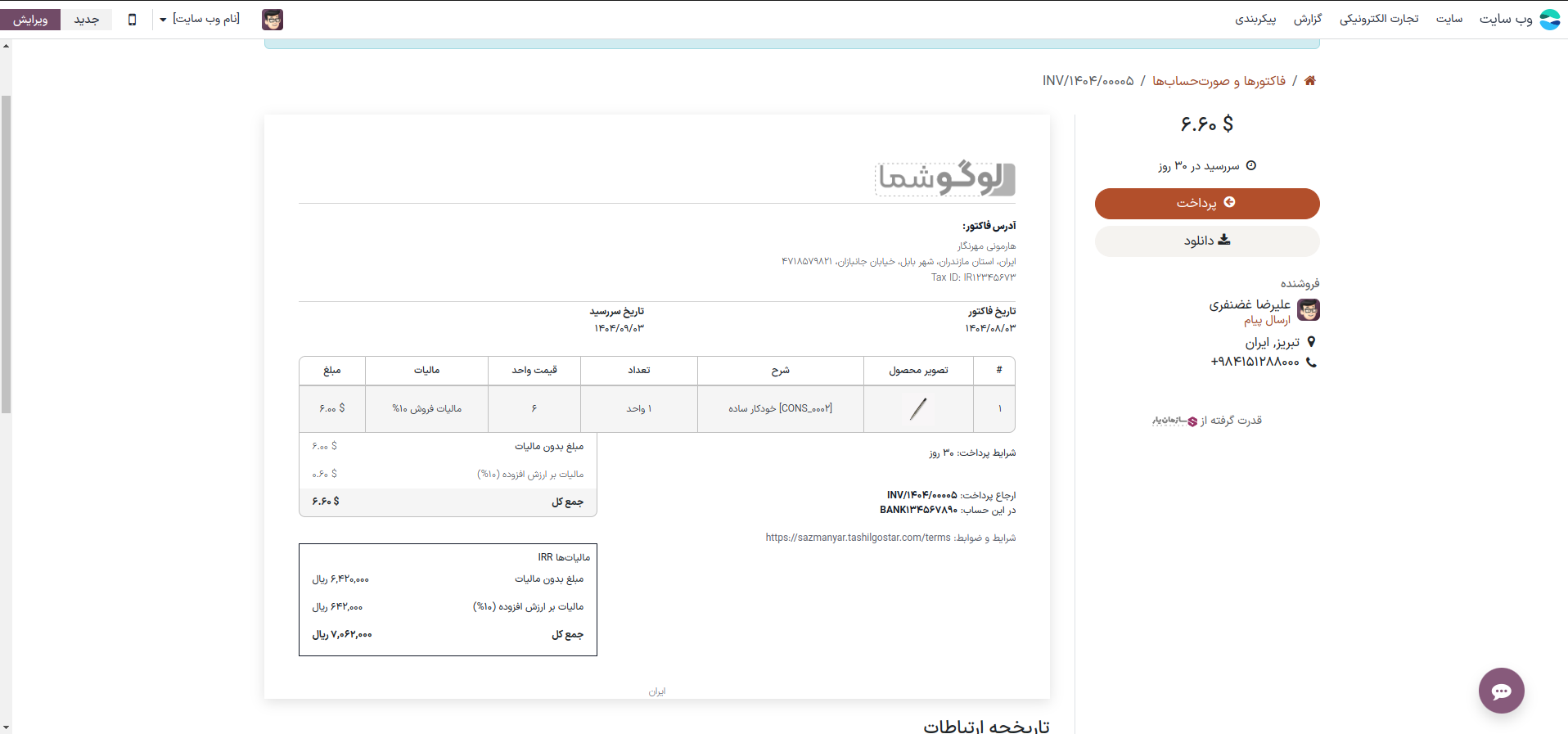 در فاکتور، دکمهای با عنوان پیشنمایش وجود دارد که به کاربر اجازه میدهد نمای پورتال مشتری را مشاهده کند.