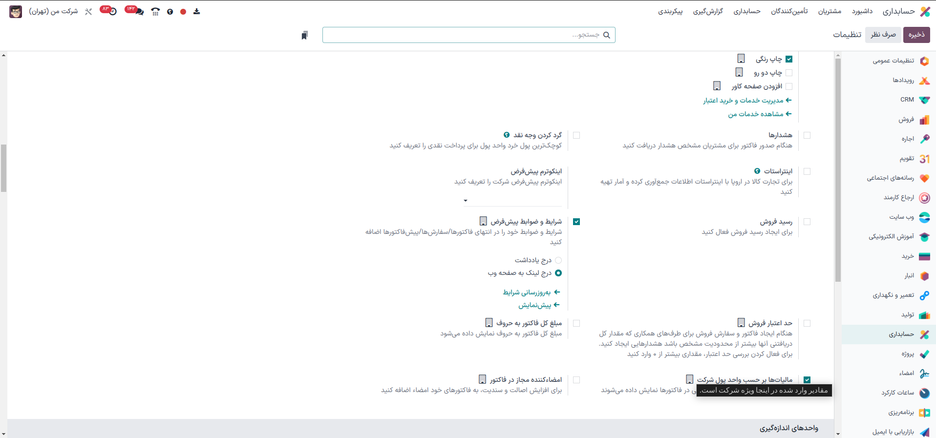 برای فعال شدن این گزینه، مشتری باید یک ویژگی دیگر به نام (مالیاتها برحسب واحد پول شرکت) را از بخش تنظیمات فعال کند.