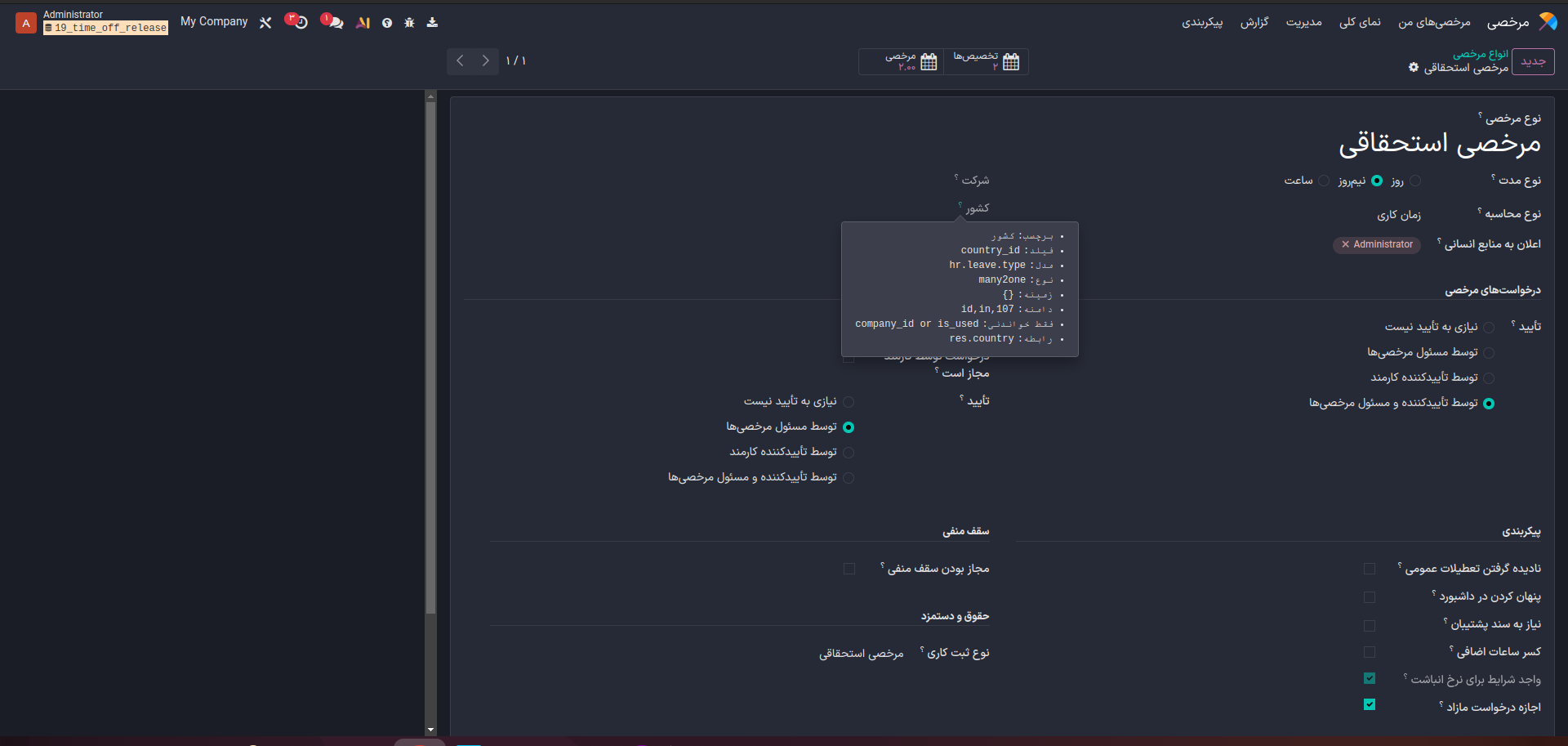 در نسخه اودوو 19 برای انواع مرخصیها یک فیلد جدید به نام "کشور" اضافه شده است.