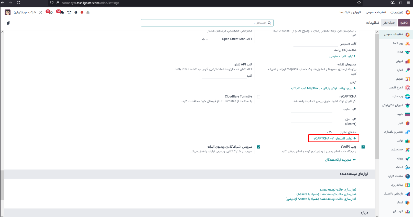 ۱) از قسمت ماژول تنظیمات، مطابق تصویر، به بخش reCAPTCHA میرویم. با کلیک بر روی لینک زیر، میتوانیم دوباره توکنهای reCAPTCHA را ایجاد کنیم تا مشکل حل شود.