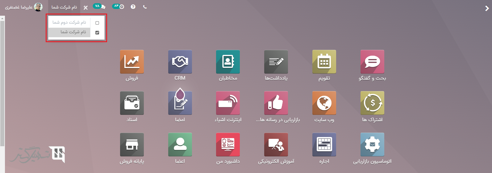 با فعال کردن کادرهای انتخاب شرکتها، امکان انتخاب یا تغییر بین چند شرکت را دارید. اگر کادر شرکتی به رنگ خاکستری باشد، همان شرکت محیطی است که از آن استفاده میشود. برای تغییر محیط، روی نام شرکت کلیک کنید. در مثال زیر، کاربر به سه شرکت دسترسی دارد که دو شرکت فعال است و محیط در حال استفاده "نام شرکت شما" میباشد.