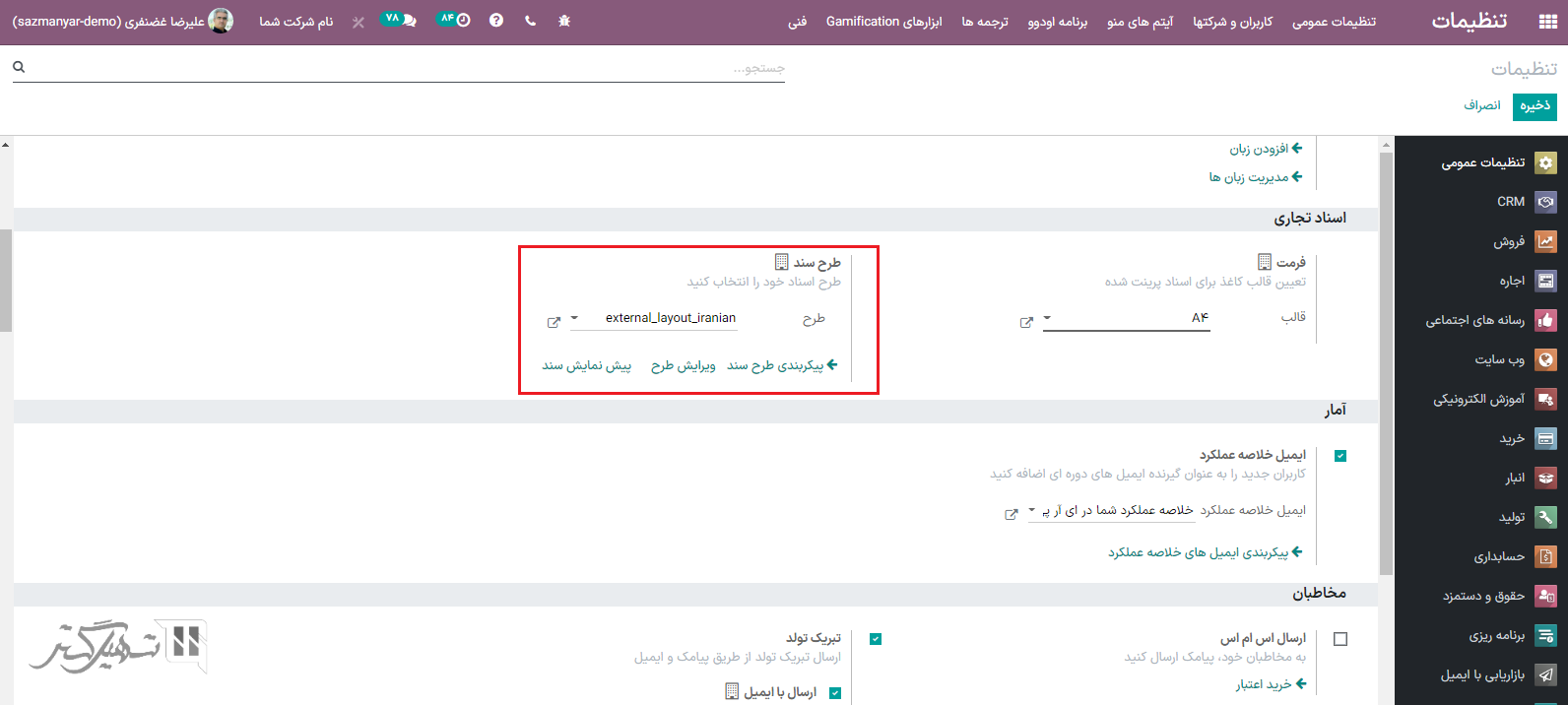 برای تنظیم فرمت اسناد بر اساس هر شرکت، فرمت مربوطه را انتخاب و فعال کنید، در قسمت تنظیمات روی پیکربندی طرح سند کلیک کنید.