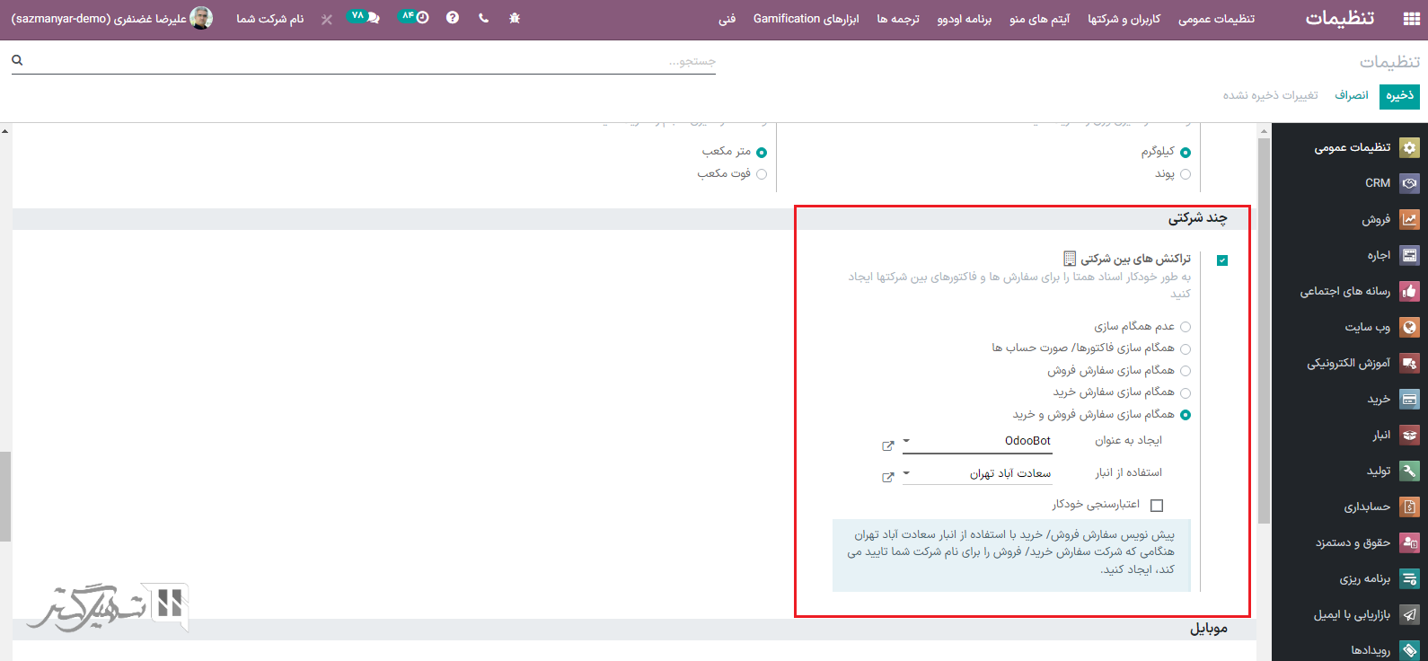 حالا، در تنظیمات، گزینه تراکنشهای بین شرکتی را فعال کنید. با انتخاب و فعالسازی شرکت مربوطه، انتخاب کنید که آیا میخواهید عملیاتهای بین شرکتها در سطح فاکتور/ صورتحساب یا سطح سفارشهای فروش/ خرید همگام سازی شود.