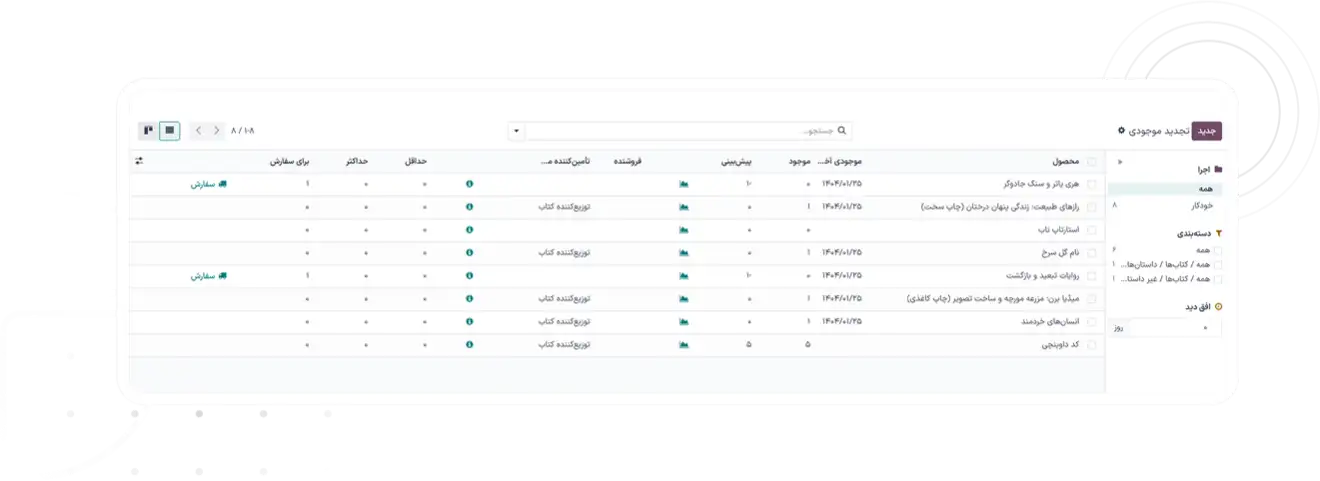 انبار همیشه پُر، فروش بدون وقفه: دیگر نگران کمبود موجودی نباشید! با راهکار مدیریت کتابفروشی سازمانیار ، زمانی که موجودی از حد تعیینشده کمتر شود، سفارشهای تأمین بهصورت خودکار ایجاد میشوند. این یعنی همیشه حداقل تعداد لازم از هر کتاب در انبار شما موجود است و فروش شما بدون توقف ادامه خواهد داشت. هوشمندانه مدیریت کنید، همیشه آماده فروش باشید!