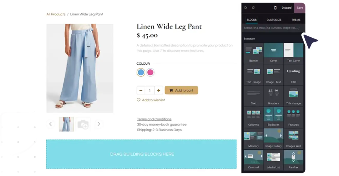 با استفاده از بلوکهای سایتساز با قابلیت کشیدن و رها کردن (Drag-and-Drop)، بهراحتی میتوانید چیدمان فروشگاه آنلاین خود را تنظیم کنید. میخواهید فیلتر و افکت به تصاویر اضافه کنید؟ یا میخواهید یک عنصر را انیمیشن کنید؟ مشکلی نیست. همه اینها و بیشتر را میتوانید بهصورت مستقیم روی صفحه انجام دهید.