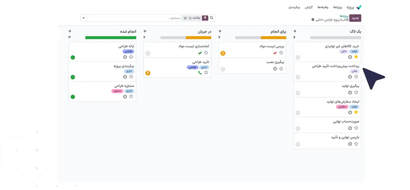سازمانیار بهترین ابزار برای اجرای حرفهای این هنر است. با استفاده از سازمانیار میتوانید به راحتی وظایف را ایجاد کرده، زمانبندی کنید و پیگیری کنید. تمام اطلاعات و سوابق مربوط به پروژه، از جمله زمانبندیها، سفارشهای خرید و سایر مستندات، در یک داشبورد متمرکز قابل دسترسی هستند، که مدیریت پروژهها را بسیار سادهتر و کارآمدتر میکند. با این ابزار، هیچچیز از نظر شما پنهان نمیماند و میتوانید بهصورت لحظهای روند پیشرفت پروژه را تحت کنترل داشته باشید.