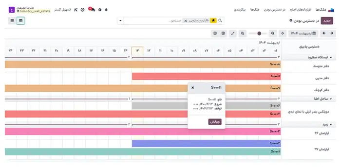 برنامه زمانبندی اجارههای خود را بهصورت بصری مشاهده کنید. نمای گانت تمامی قراردادها و وضعیت خالی بودن املاک را در یک نگاه نشان میدهد، به شما این امکان را میدهد که بهراحتی وضعیت دسترسی املاک خود را مدیریت کرده و برنامهریزی دقیقی برای آینده داشته باشید.