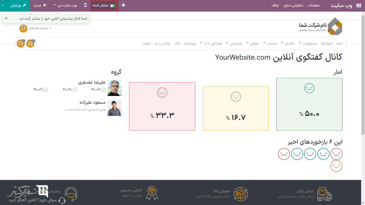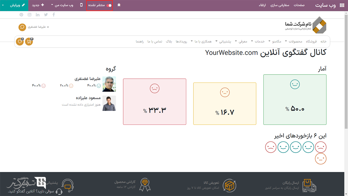 برای منتشر کردن امتیازات یک کانال در وبسایت خود، به برنامه وب سایت> پیکربندی> و گزینه تنظیمات بروید، به فرم کانال خود دسترسی پیدا کنید، روی گزینه برو به وبسایت کلیک کنید و در صفحه باز شده دکمه منتشر نشده را بزنید. با کلیک روی این گزینه عنوان آن به منتشر شده تغییر میکند و این یعنی امتیازات این کانال عمومی شده است.