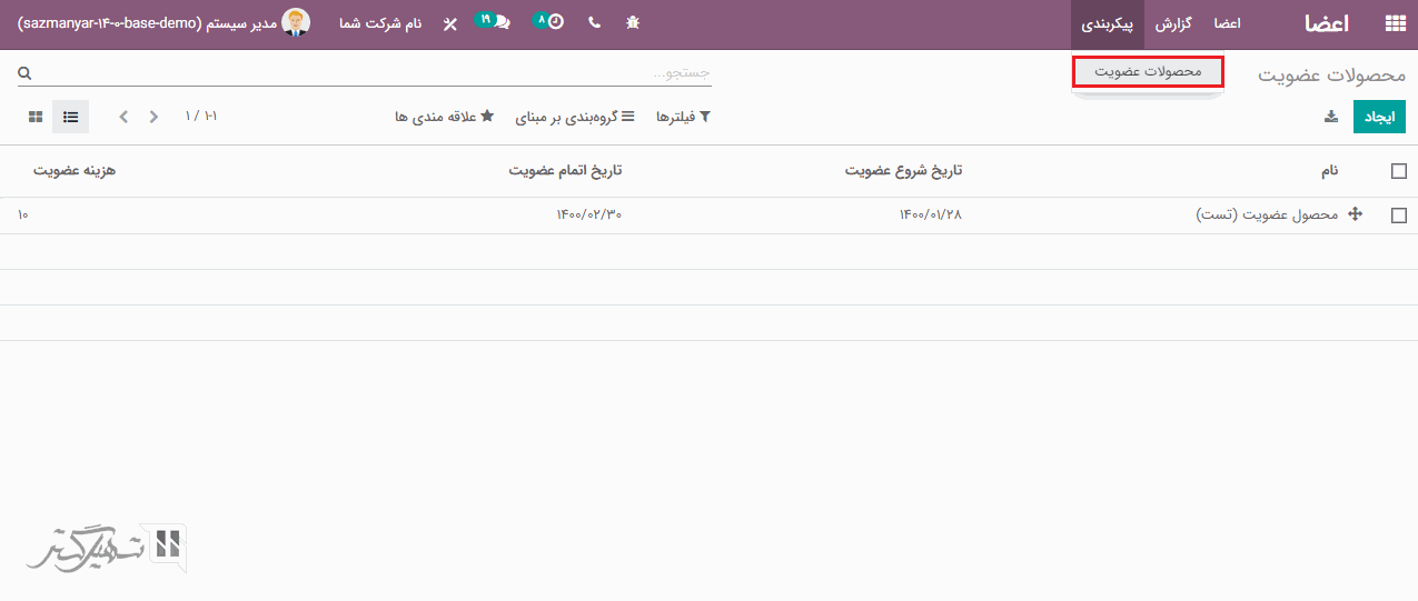 قبل از ایجاد اعضا، ابتدا باید محصولات عضویت را ایجاد کنیم. از طریق ماژول اعضا> پیکربندی> محصولات عضویت، با کلیک بر روی دکمه "ایجاد" محصول عضویت خود را ایجاد کنید: