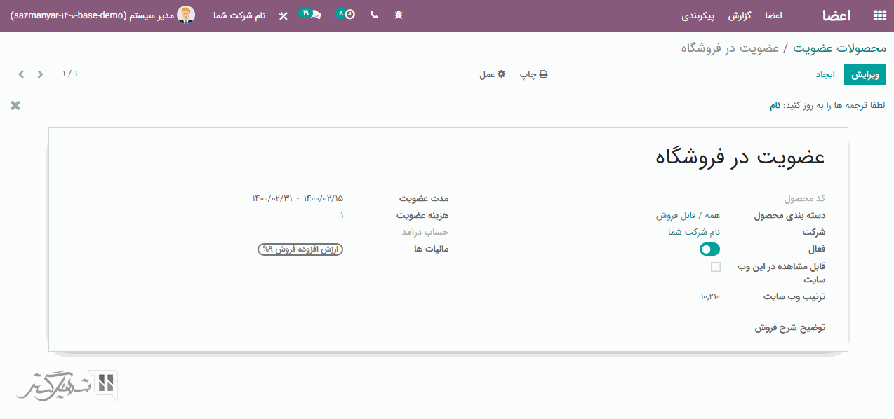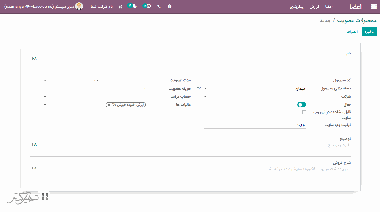 شما باید نام محصول، کد محصول، دسته بندی محصول، شرکت و سایر اطلاعات خود را پر کنید. این فرم دارای بسیاری از فیلدهای الزامی از جمله مدت عضویت (مدت زمانی که عضویت آغاز خواهد شد)، هزینه عضویت (قیمت فروش محصول به مشتریان)، حساب درآمد (برای استتفاده از مقدار پیش فرض دسته بندی محصول، این فلید را خالی بگذارید) است که باید توسط کاربر پر شود.