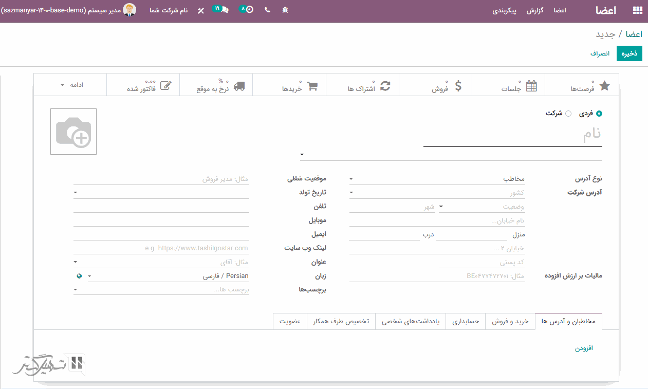 در فرم ایجاد، کاربر می تواند تمام اطلاعات اولیه و مخاطب ارائه شده توسط عضو را وارد کند. اعضا می توانند یک شخص (فردی) یا یک شرکت باشد.