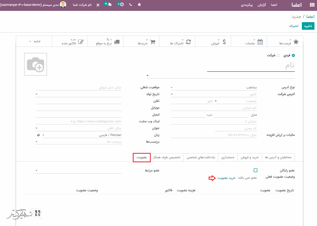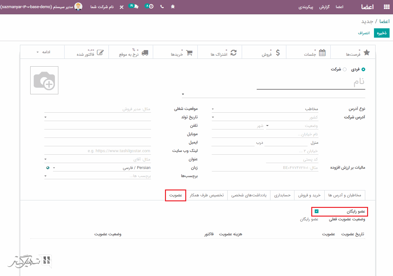 ماژول عضویت اودو برای ایجاد عضویت رایگان، پشتیبانی ارائه می دهد. از تب "عضویت" واقع در فرم اعضا، می توانید به گزینه های عضویت دسترسی داشته باشید.