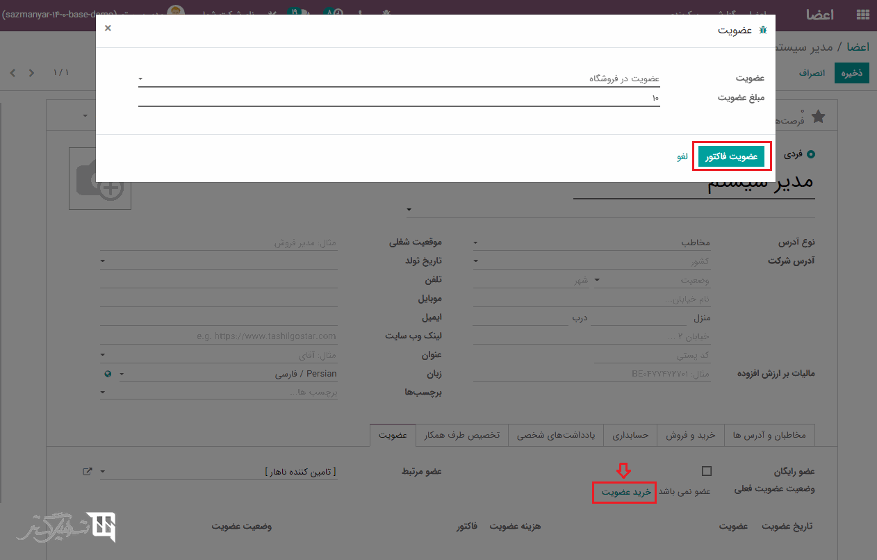 با کلیک بر روی گزینه "خرید عضویت" یک ویزارد مانند تصویر زیر برای کاربر ظاهر خواهد شد که می تواند در آنجا عضویت و مبلغ عضویت را مشخص کرده سپس بر روی دکمه "عضویت فاکتور" کلیک کند: