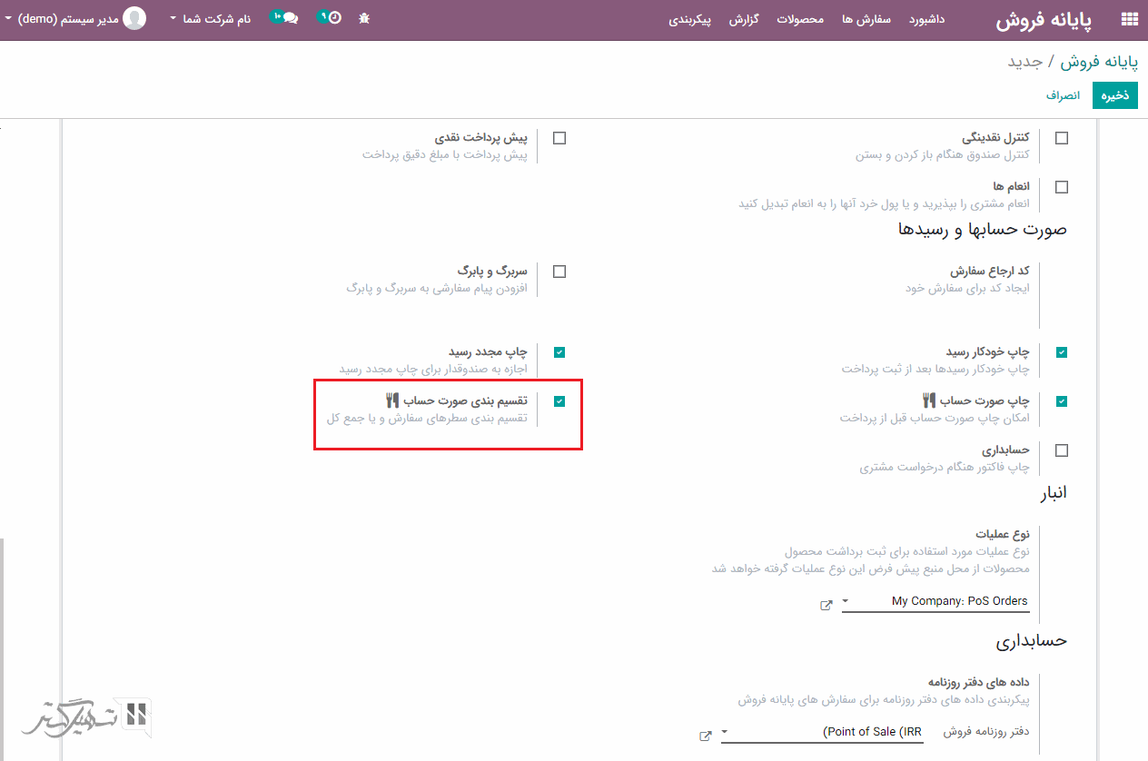 این گزینه تقسیم صورت حساب را در پایانه فروش فعال می کند.