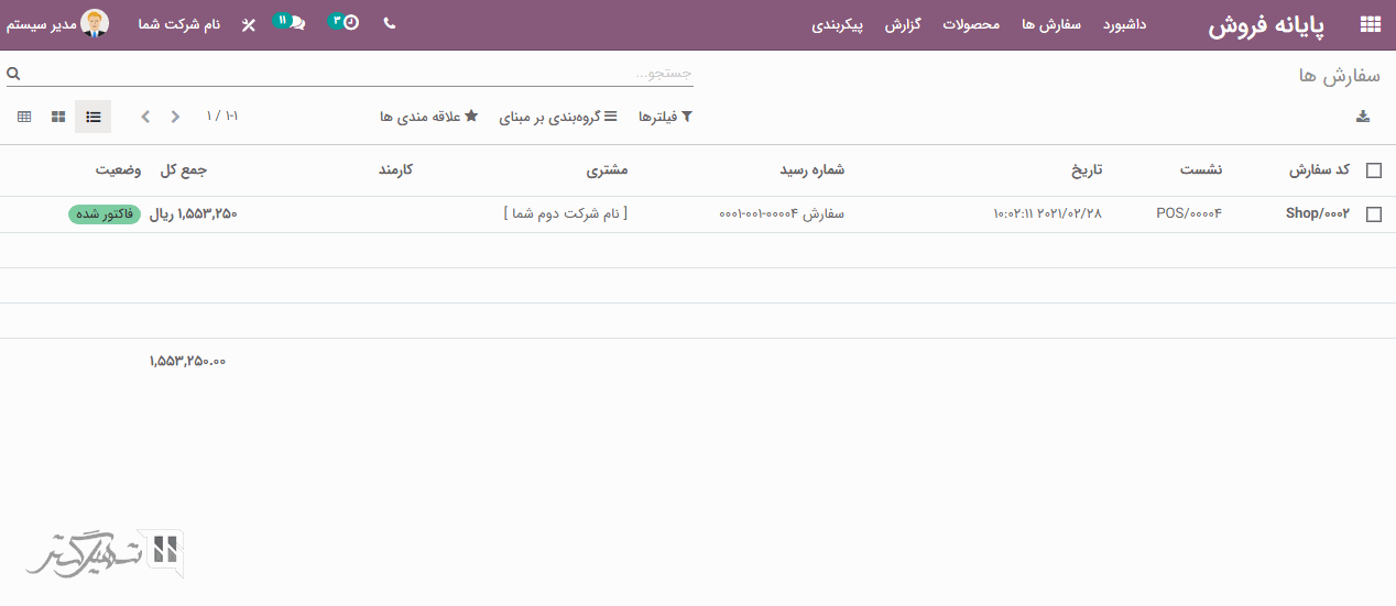کاربر می تواند سفارشات ایجاد شده در ماژول پایانه را در ماژول پایانه فروش> سفارش ها> سفارش ها مشاهده کند. در اینجا کد سفارش، نشست، تاریخ، شماره رسید، مشخصات مشتری، کارمندی که فروش را انجام داده است، جمع کل و وضعیت سفارش فروش شرح داده شده است.