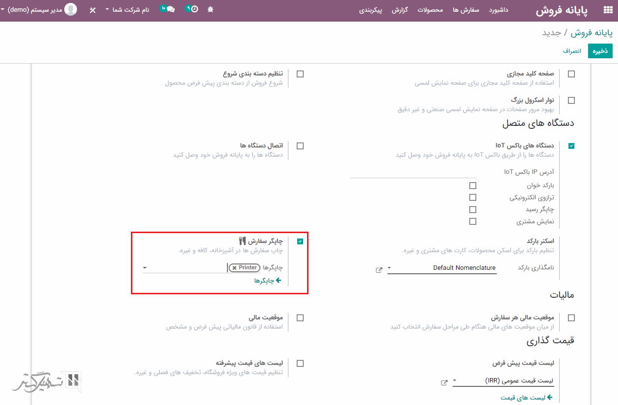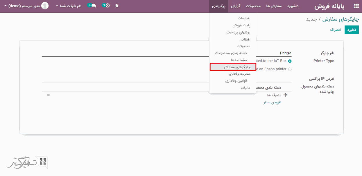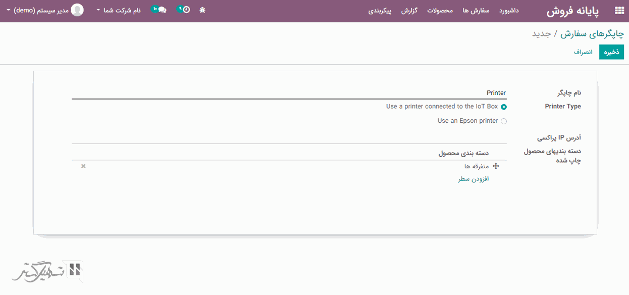 نکته: توجه داشته باشید که برای اتصال چاپگر به پایانه فروش مورد نظر، به یک IoT Box نیاز دارید.