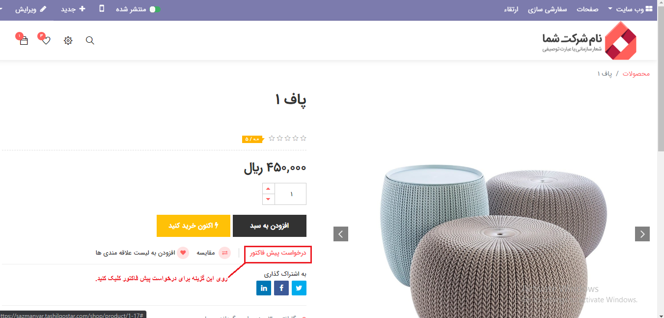 در صفحه محصول گزینه "درخواست پیش فاکتور" را پیدا خواهید کرد. با کلیک بر روی درخواست پیش فاکتور، مشتری می تواند نسبت به قیمت کالای خاصی درخواست کند.