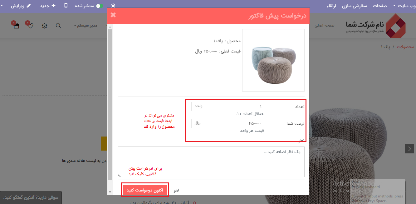مشتری می تواند با قیمت و تعداد سفارشی برای محصول پیش فاکتور ایجاد کند.